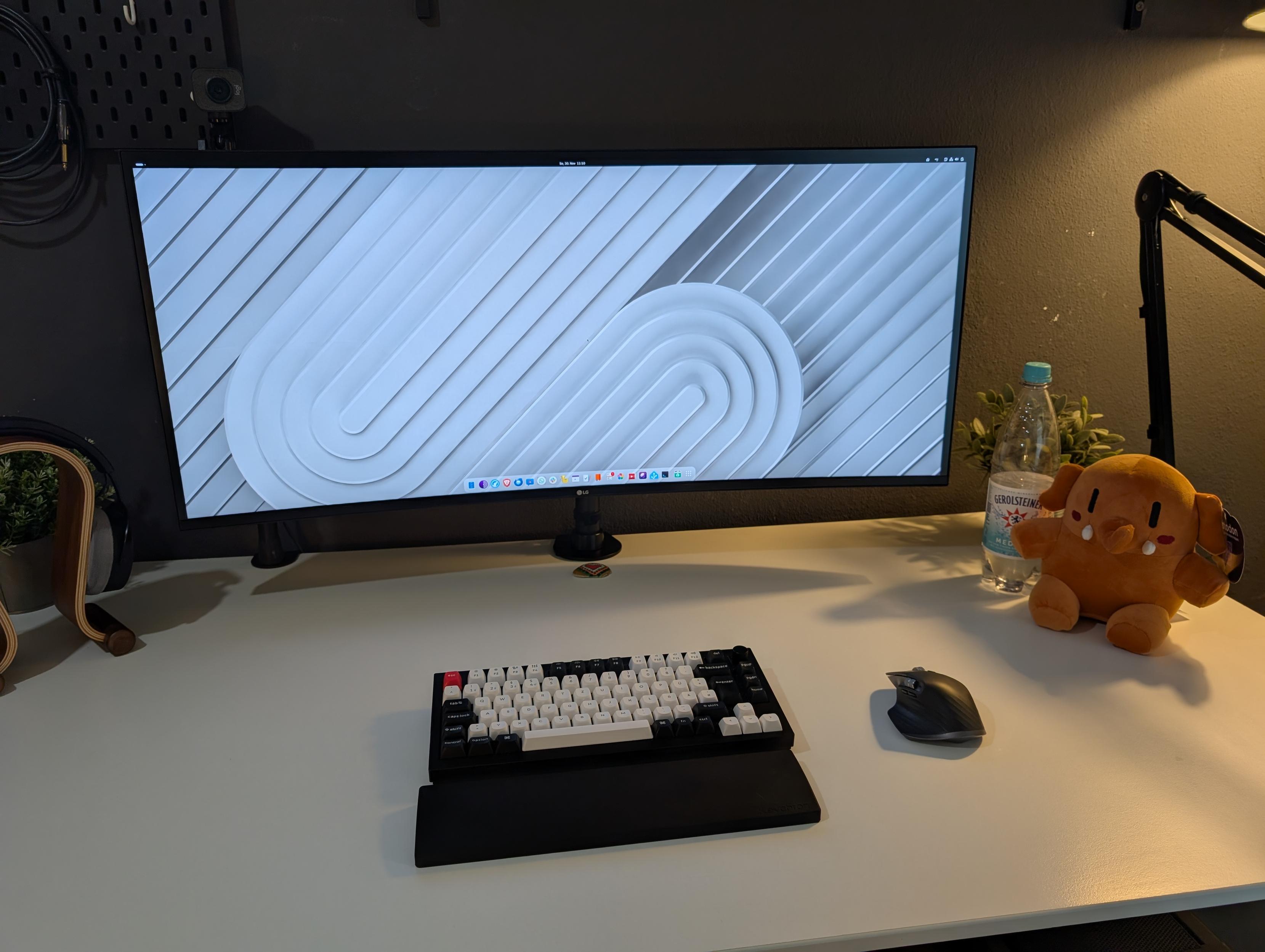 New plushie being very supportive at work today :) #plushtodon #desktop #desk #fedora